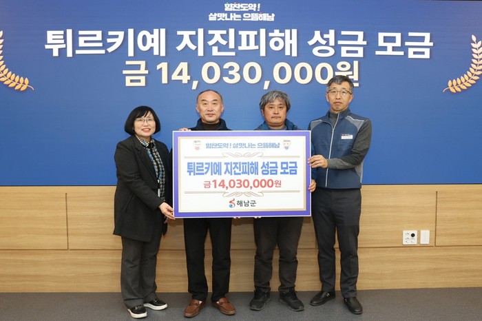 이번 성금 모금은 해남군 명현관 군수를 비롯한 전 직원이 참여해 지난주부터 일주일간 성금을 모았다. 여기에 전국공무원노동조합 해남군지부, 해남군비정규직노동조합, 전국민주연합노동조합 해남군지부와 한땀동호회에서도 뜻을 함께해 튀르키예 지진 피해가 조속히 복구되고 안정되기를 바라는 마음을 전달하게 됐다.