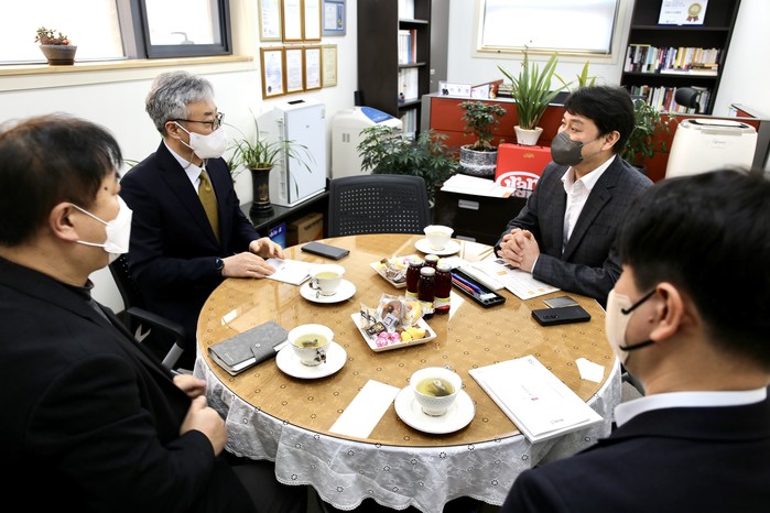 | ▲ 수원시니어클럽을 방문한 조석환 의장(오른쪽 두 번째)이 의견을 나누고 있다 (사진제공=수원시의회) |