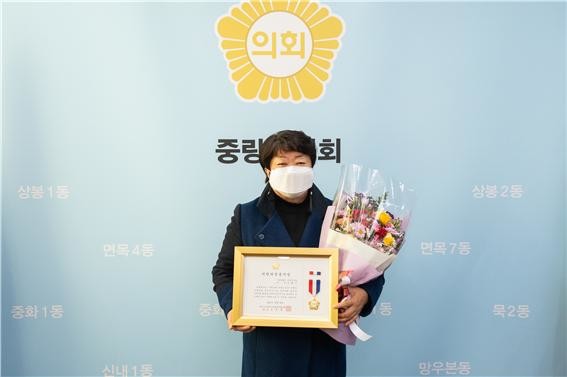 | ▲ 지방의정봉사상을 수상한 오화근 의원이 기념촬영을 하고 있다. (사진제공=중랑구의회) |