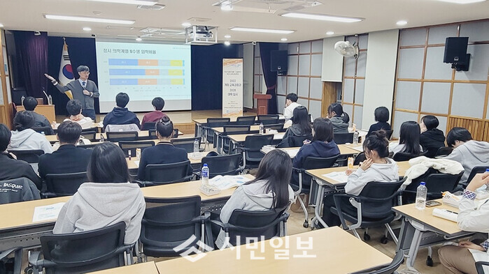 | ▲ 광주시교육청이 지난 29일, 시교육청교육정보원 소강당에서 진행한 2기 토론·논술학교 NDD 교육과정 특강에서 광주인성고 김형래 교사가 개정교육과정과 2028 대학 입시를 주제로 학생들에게 강의를 하고 있다. / 광주시교육청 제공 |