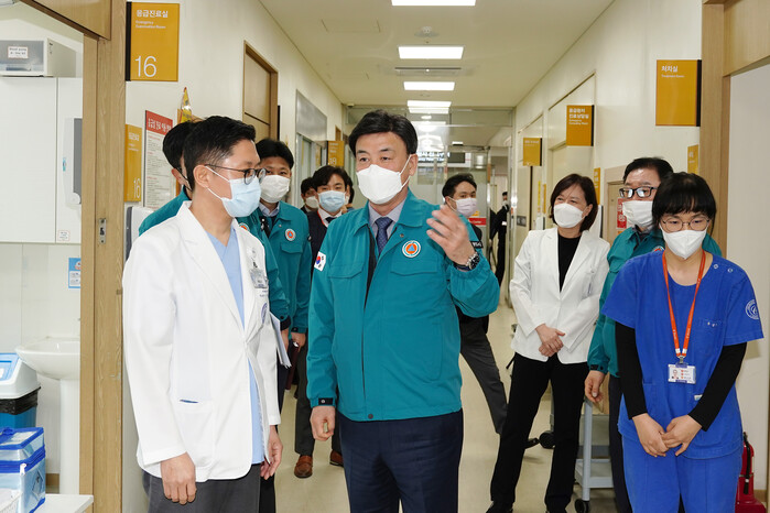 방세환 경기 광주시장은 27일 최근 의료계 집단행동과 관련해 참조은병원(광주대로 45) 응급의료센터를 방문, 의료진을 격려하고 현황을 점검했다. 사진은 방 시장(왼쪽 두 번째)과 의료진이 대화를 나누고 있는 모습. (사진=광주시청 제공)