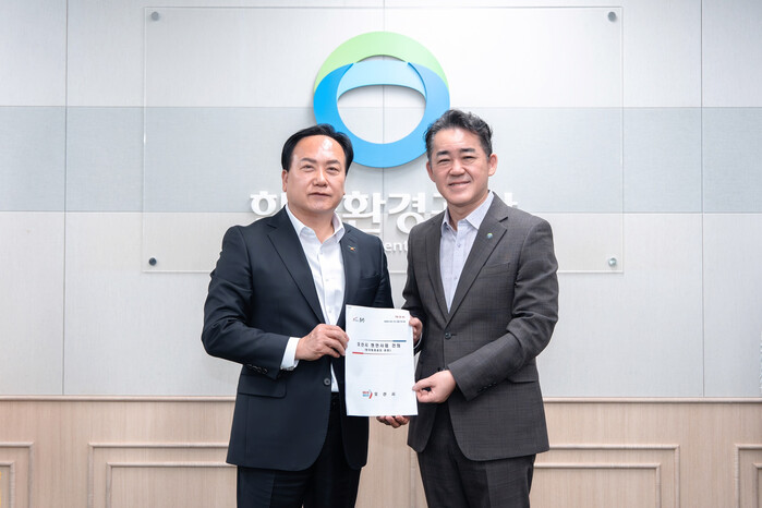 경기 오산시가 최근 한국환경공단을 방문해 임상준 이사장과 환담을 나눴다. 이 자리에서 하수처리시설 민간투자사업의 조속한 추진을 비롯한 주요 현안에 대한 협조를 요청했다. 사진은 이권재 시장(왼쪽)이 임 이사장과 기념촬영을 하는 모습. (사진=오산시청 제공)
