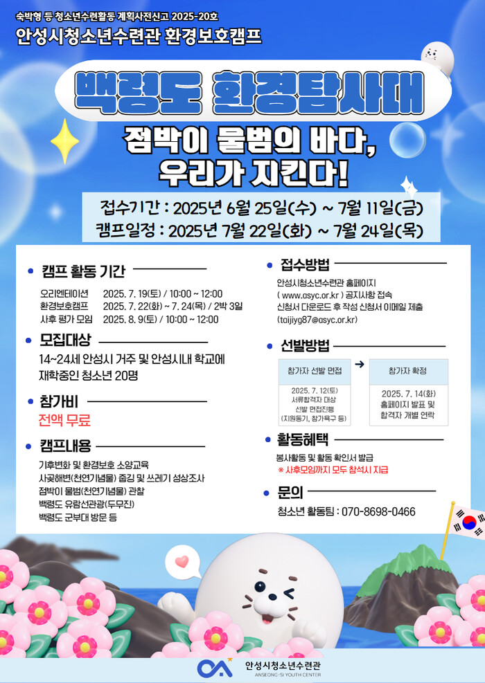 [안성=오왕석 기자] 안성시청소년수련관(관장 조인호)은 오는 7월 11일까지 안성시 거주 중이거나 관내 학교에 재학 중인 14세 ~ 24세 청소년을 대상으로 환경보호캠프 ‘백령도 환경탐사대’ 참가자를 모집한다.