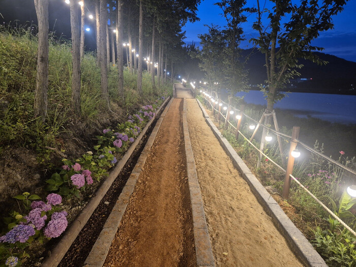 해당 사업은 걷기 좋은 공원 환경을 조성하고 군민의 건강 증진과 심리적 안정을 도모하기 위해 추진됐으며, 형형색색 수국의 향기를 따라 걷는 맨발로 걷는 길(어싱길)에는 조명 시설도 함께 설치돼 야간에도 안전하게 산책을 즐길 수 있다.
