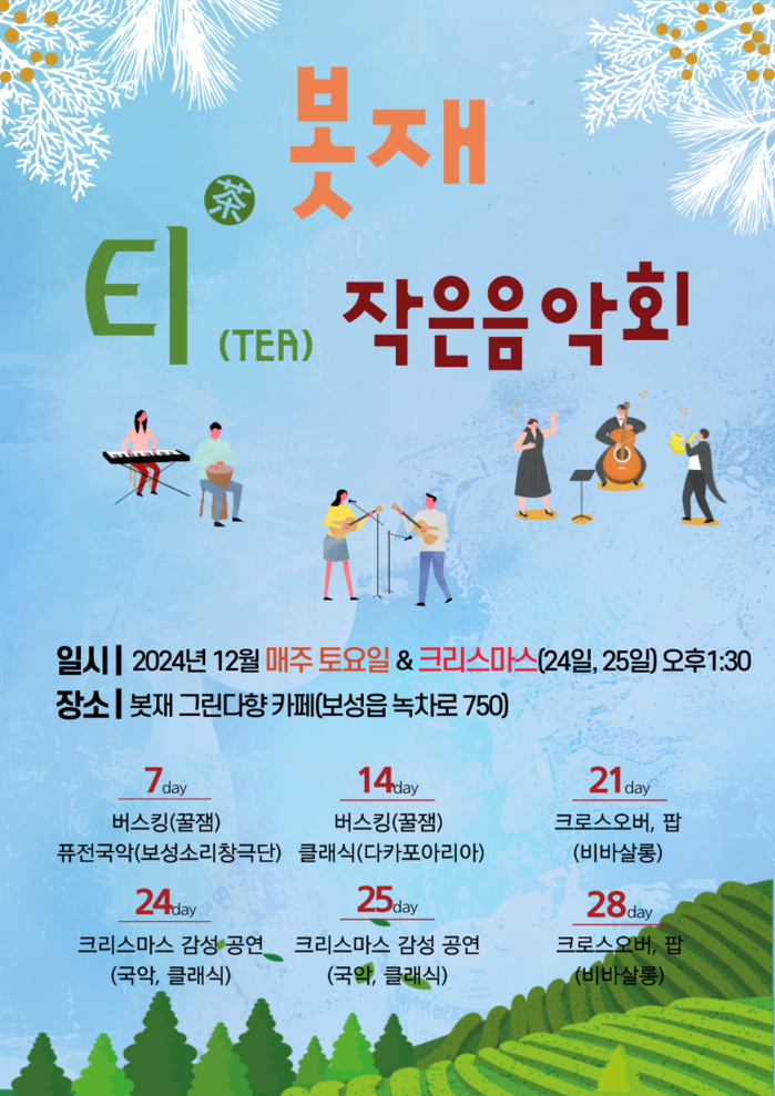 군 관계자는 “따뜻한 크리스마스와 연말이 될 수 있도록 음악회를 준비했다”라며 ”차와 소리, 예향의 고장을 대표하는 보성의 랜드마크 봇재에서 보성차를 마시며 멋진 공연을 감상하시길 바란다”고 전했다.