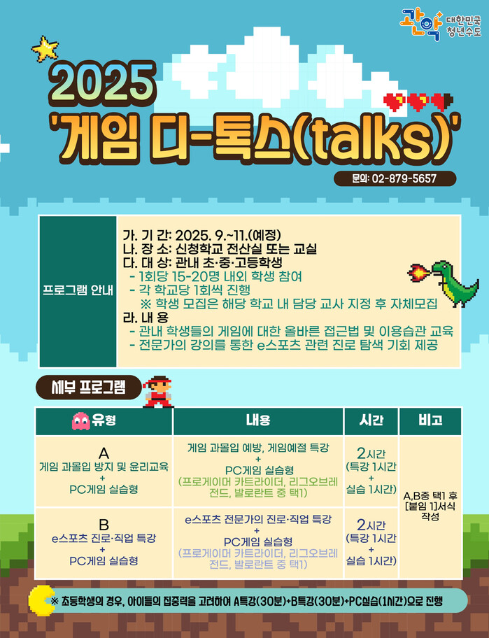 [시민일보 = 문민호 기자] 관악구(구청장 박준희)는 청소년들이 게임을 건강하게 활용할 수 있도록 돕기 위해 오는 9월부터 ‘2025 「게임 디-톡스(Talks)」’ 프로그램을 운영한다.