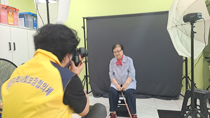경기 이천시 율면 지역사회보장협의체는 최근 저소득층 노인에게 장수사진과 노년시절을 추억할 수 있는 인생사진을 제작해 선물하는 '인생사진 촬영소'를 진행했다. 사진은 대상노인이 인생사진을 촬영하고 있는 모습. (사진제공=이천시청)