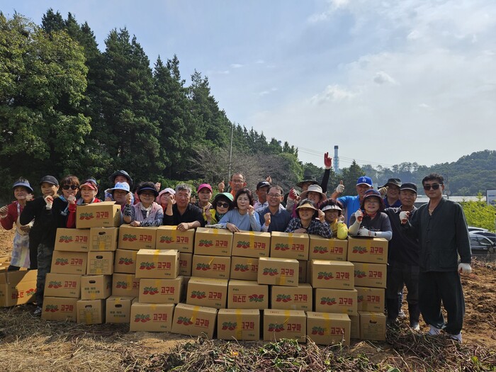경기 오산시 남촌동은 4일 통장단협의회 등 50여명이 참여한 가운데 사랑의 고구마 수확 행사를 실시해 150상자를 포장했다. 사진은 이날 참여한 봉사자들이 기념촬영을 하고 있는 모습. (사진=오산시청 제공)