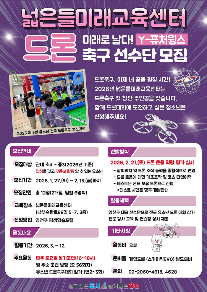 [시민일보 = 박소진 기자] 서울 양천구(구청장 이기재)는 드론 주행 기술과 스포츠를 결합한 유소년 드론축구단 ‘Y-퓨처윙스’를 창단하고, 하늘 위에서 펼쳐지는 짜릿한 승부를 함께 경험할 창립 멤버를 오는 2월13일까지 모집한다고 밝혔다.