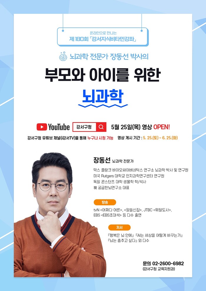 ‘부모와 아이를 위한 뇌과학’이라는 주제로 진행되는 이번 강좌에는 장동선 박사가 강사로 나서 뇌 탄생 이유, 연령대별 뇌 발달과정 등을 소재로 다채로운 이야기를 전달할 예정이다.