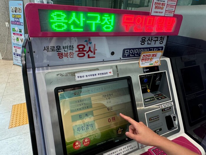 [시민일보 = 여영준 기자] 서울 용산구(구청장 박희영)가 이달부터 지역내 무인민원발급기에서 주민등록등·초본 등 민원 수요가 많은 서류 12종에 대해 발급 수수료 없이 무료로 발급하고 있다고 밝혔다.
