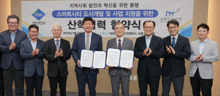 | iH와 청운대학교간 업무협약 체결행사 참가자들이 포즈를 취하고 있다. (사진=인천도시공사) |