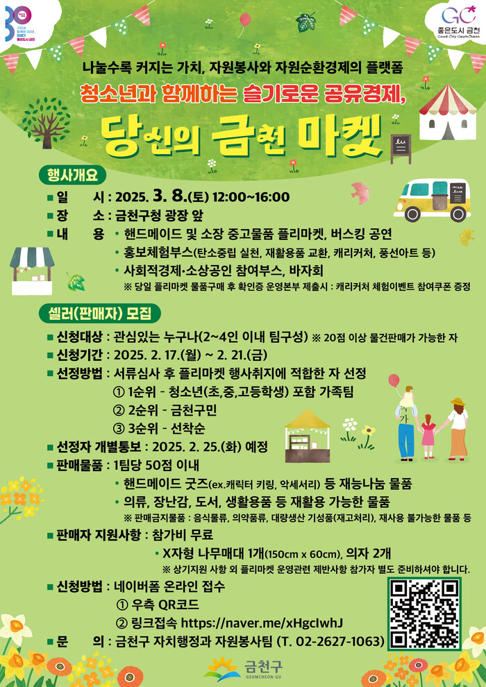 [시민일보 = 여영준 기자] 서울 금천구(구청장 유성훈)는 오는 3월8일 낮 12시~오후 4시 구청 광장에서 청소년과 함께하는 주민참여형 벼룩시장 ‘당신의 금천 마켓(당금마켓)’을 개최한다고 밝혔다.