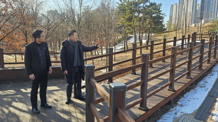 | ▲ 강동구의회 박원서 부의장(오른쪽)과 원창희 윤리특별위원장(왼쪽)이 상일2동 능골근린공원 무장애 데크길을 살펴보고 있다. (사진=강동구의회 제공) |