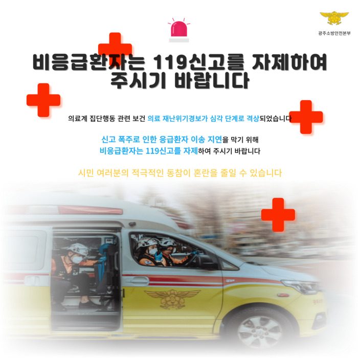 [광주=정찬남 기자] 광주광역시소방안전본부는 최근 의료계 집단행동 심화로 인한 119신고 폭주와 응급환자 이송 지연을 막기 위해 비응급환자의 119신고 자제를 당부했다.