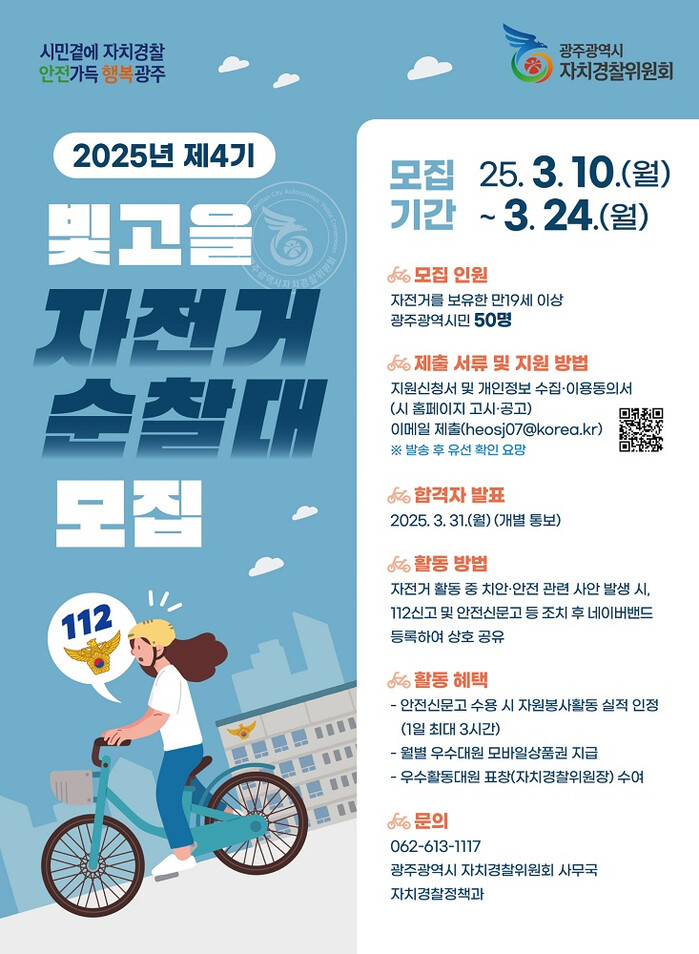 제4기 순찰대 모집 기간은 10일부터 24일까지며, 서류 심사를 거쳐 50명을 선발한다. 자전거를 보유하고 이를 이용한 활동이 가능한 19세 이상의 광주시민이면 누구나 지원할 수 있다. 지원자는 광주시 누리집 고시·공고 또는 광주자치경찰위원회 누리집에서 신청서를 내려받아 작성한 후 이메일로 제출하면 된다.