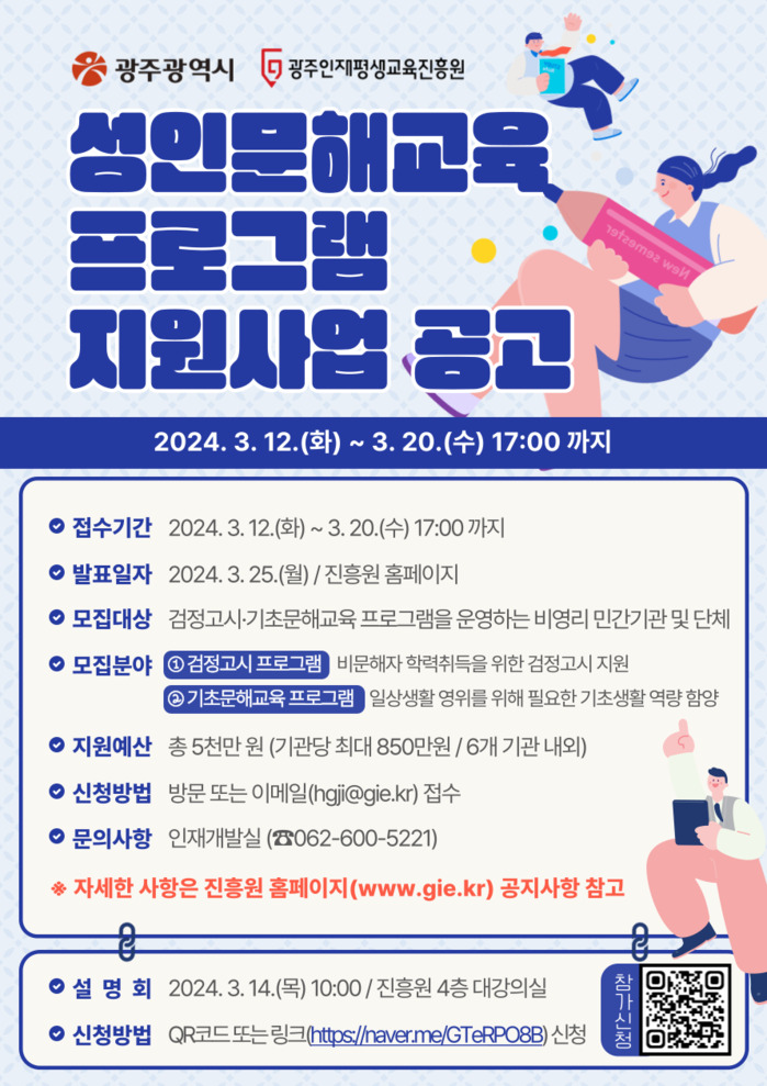 ‘광주 성인문해교육 프로그램 지원사업’ 사전 설명회는 3월 14일 오전 10시, 진흥원 4층 대강의실에서 개최된다. 설명회는 사업 전반에 대한 세부사항 안내와 질의응답으로 진행된다. 공모에 관심 있는 기관은 진흥원 홈페이지 공고문 내 QR코드나 링크를 통해 신청 후 참여할 수 있다.