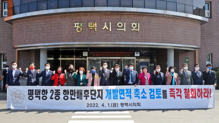 시의회는 지난 1일 시의회 본관 앞에서 의원 16명 전원이 참여한 가운데 ‘평택항 2종 항만배후단지 기존개발면적 유지 건의’ 성명서를 발표했다.