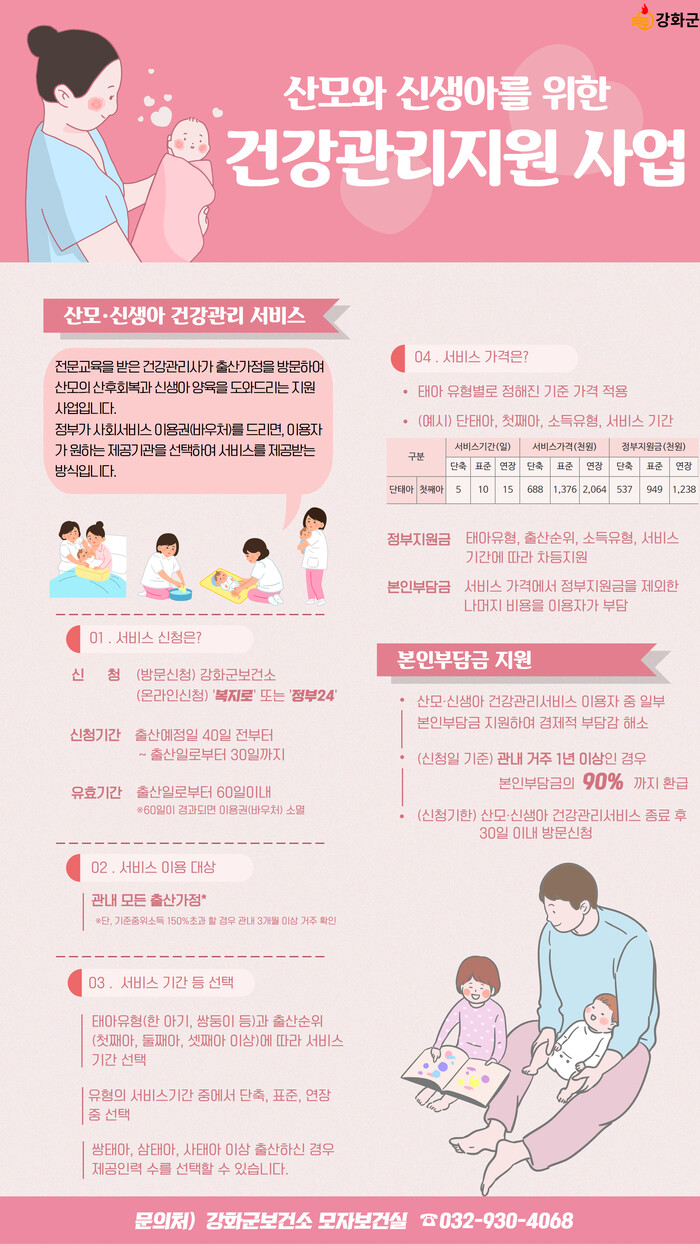 이번 사업은 전문교육을 받은 건강관리사가 출산가정을 방문해 최소 5일에서 최대 40일까지 산모의 회복과 신생아의 돌봄을 지원하면, 건강관리사 서비스 이용료 중 본인부담금 일부를 강화군이 지원한다.