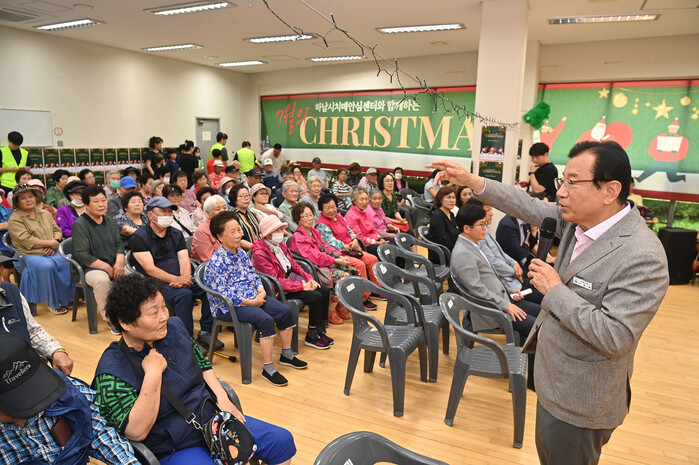 | ▲ 이현재 시장(오른쪽)이 지난 12일 치매안심마을로 지정된 미사강변도시 13단지 아파트에서 진행된 '7월의 크리스마스 행사'에 참석해 축사를 하고 있다. (사진=하남시청 제공) |