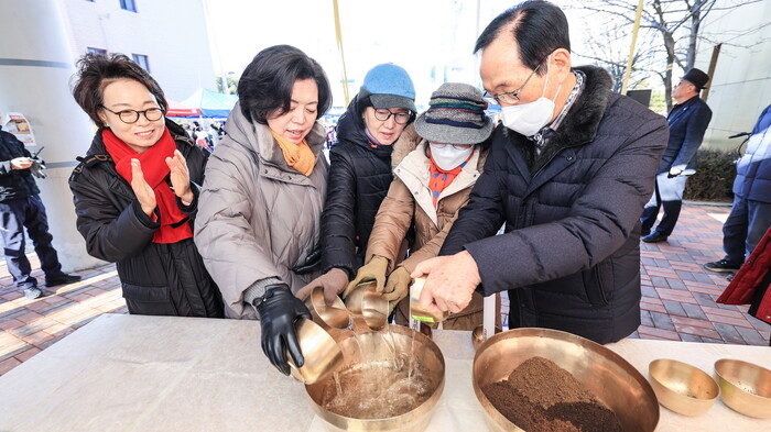 경기 과천시 문원동은 13일 정월대보름을 맞아 주민 300여명과 함께 민속놀이 행사 ‘문원 어울마당’을 통해 풍성한 한 해의 시작을 기원했다. 사진은 신계용 시장(왼쪽 두 번째)이 주민들과 합수ㆍ합토식을 진행하는 모습. (사진=과천시청 제공)