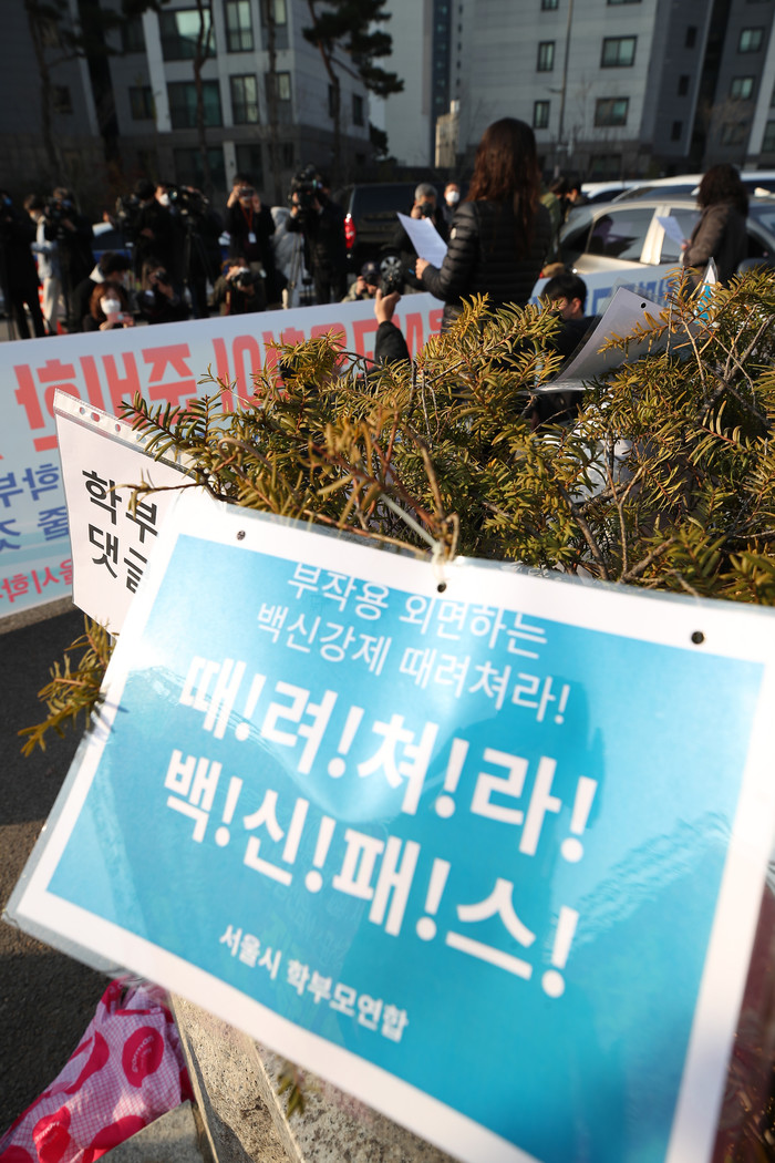 | ▲ 7일 오전 서울 종로구 서울시교육청 앞에서 서울시학부모연합이 '전면등교 대책 마련 백신패스 철회 촉구' 기자회견을 하고 있다. (사진제공=연합뉴스) |