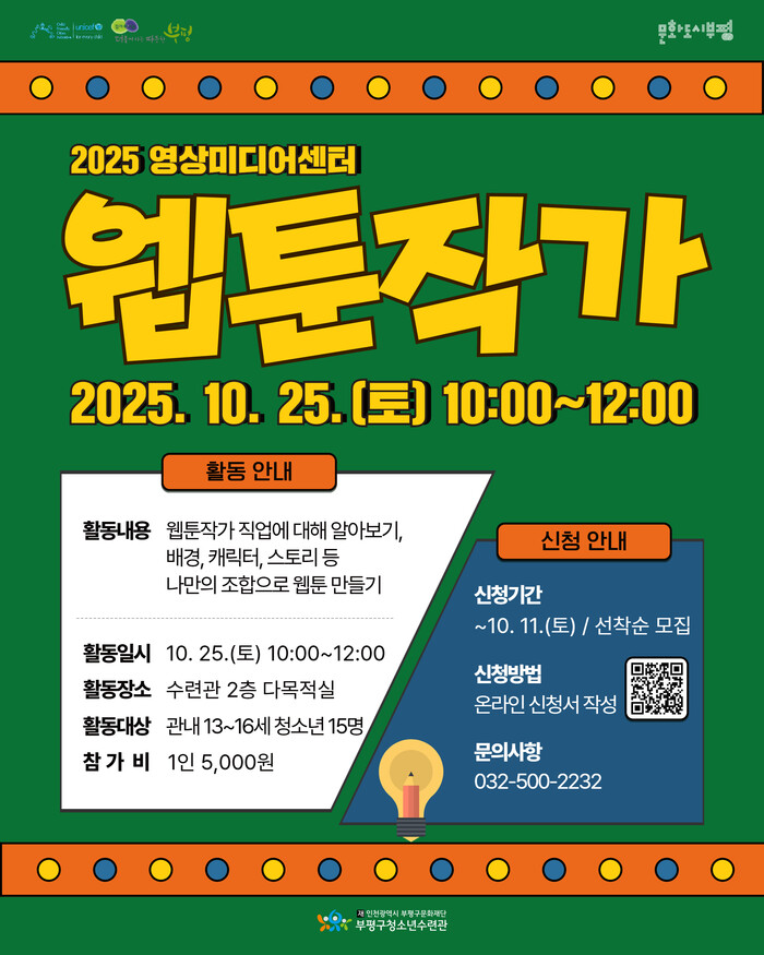 [인천=문찬식 기자] 인천 부평구 청소년수련관은 오는 10월11일까지 영상미디어센터 10월 일일특강 ‘웹툰작가 직업 특강’의 참가자를 모집한다.
