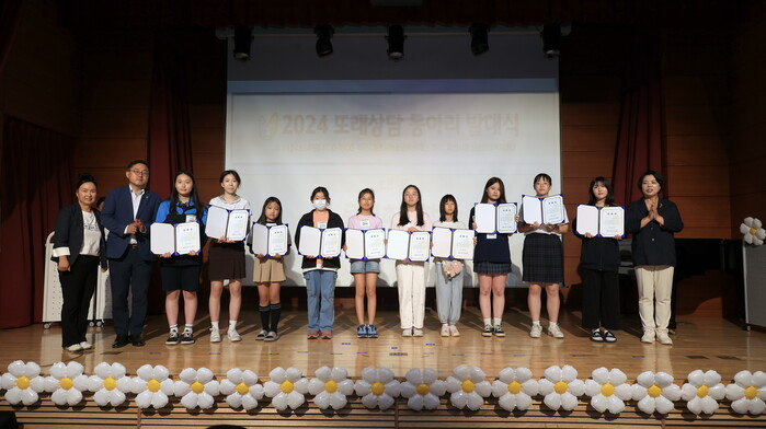 경기 과천시 청소년상담복지센터는 최근 청소년수련관 4층 공연장에서 ‘학교상담복지사업 운영 성과보고회’와 ‘또래상담 동아리 발대식’을 개최했다. 이날 행사에는 신계용 과천시장과 청소년상담복지센터 관계자와 지역내 12개교 학교상담복지사, 각 학교에서 또래상담자로 활동하고 있는 청소년 80여명이 함께 참석했다. 사진은 신 시장(맨 오른쪽)이 참여자들과 기념촬영을 하고 있는 모습. (사진=과천시청 제공)