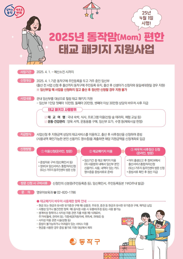 [시민일보 = 여영준 기자] 서울 동작구(구청장 박일하)는 저출생 극복과 출산 친화 환경 조성에 앞장서고자 서울시 최초로 ‘동작 맘(Mom) 편한 태교 패키지 지원사업’을 추진한다고 밝혔다.