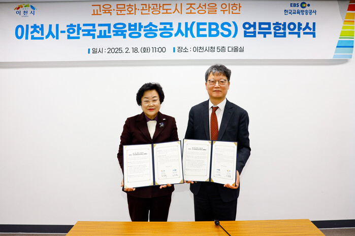 경기 이천시가 최근 한국교육방송공사와 교육, 문화, 관광 등 다양한 분야에서 협력한다는 업무협약을 체결했다. 사진은 협약식에서 김경희 시장(왼쪽)과 김유열 EBS 사장(오른쪽)과 기념 촬영을 하는 모습. (사진=이천시청 제공)