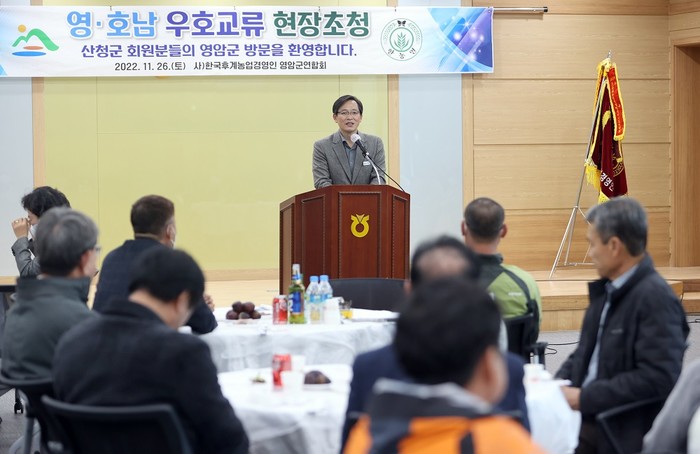 | ▲ 우승희 영암군수가 지난 26일 영암군한농연이 경남산청군 한농연 초청 영호남 우호교류 현장에 참석해 인사말을 하고 있다. / 사진=영암군 제공 |