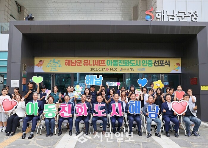 군은 27일 명현관 해남군수, 이성옥 해남군의회 의장, 아동친화도시조성 추진위원, 아동권리지킴이(옴부즈퍼슨), 아동, 청소년참여단 등 50여 명이 참석한 가운데 군 청사에 유니세프 아동친화도시 인증 현판을 게첨하고 아이들이 안전하고 행복하게 살아갈 수 있는 도시 조성을 위한 아동친화도시 선포식을 가졌다.