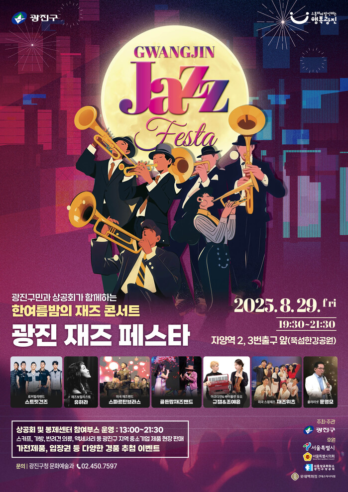 [시민일보 = 여영준 기자] 광진구(구청장 김경호)는 오는 29일 자양역 3번 출구 앞 뚝섬한강공원에서 구민과 함께하는 ‘한여름 밤의 광진 재즈 페스타(Jazz Festa)’를 개최한다.