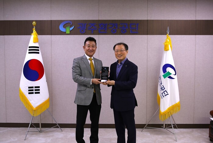 | ▲ 김병수 광주환경공단 이사장(오른 쪽), 한국백혈병 소아암협회 광주전남지회로부터 감사패 수상 기념촬영 / 광주환경공단 제공 |
