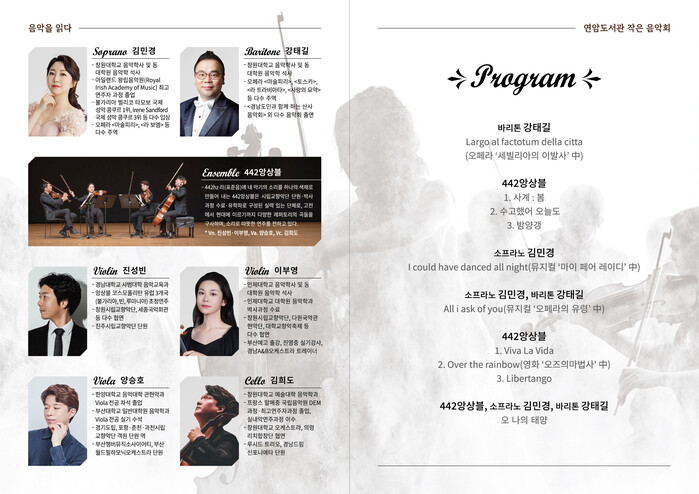 ‘음악을 읽다 : 연암도서관 작은음악회’라는 주제로 열리는 이번 음악회는 도서관이 단순한 독서공간을 넘어 복합문화공간으로서 거듭나기 위해 마련된 행사로 현악 4중주와 팝페라 성악가들의 협연 무대로 클래식의 향연을 한껏 느낄 수 있는 곡들로 채워진다.