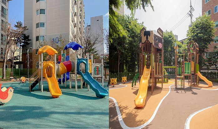 | ▲ 양천구 ‘곰과 호랑이’가 주제인 테마형 놀이터로 변신한 홍익어린이공원 전·후. (사진=양천구청 제공) |