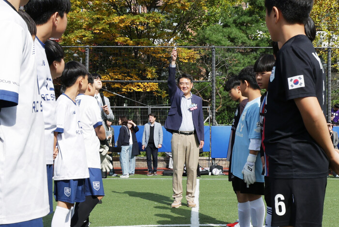 오승록 서울 노원구청장이 최근 노해체육공원에서 열린 2025 노원 청소년 액티브 페스타 ‘우다다’에 참석했다. 사진은 오 구청장이 유소년 풋살 경기 시작을 알리는 모습. (사진=노원구청 제공)