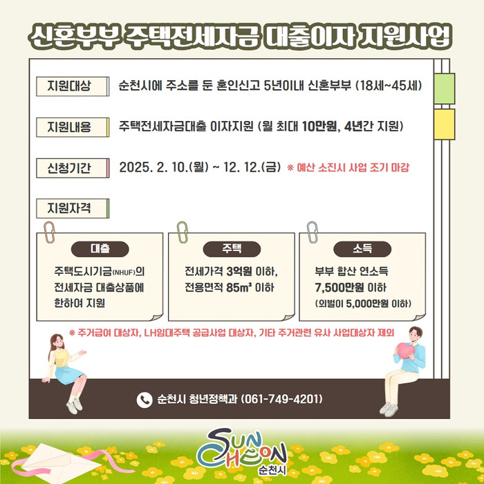신혼부부 주택전세자금 대출이자 지원사업은 시에 거주하는 무주택 신혼부부에게 전세자금 대출이자를 월 10만원씩 최대 4년간 지원하는 사업이다.