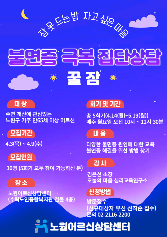 [시민일보 = 박소진 기자] 서울 노원구(구청장 오승록)가 오는 14일부터 5월19일까지 불면증으로 고통받는 노인들을 위해 ‘이제부터 꿀잠: 건강한 수면 습관 형성 프로그램(이하 꿀잠)’을 진행한다고 1일 밝혔다.
