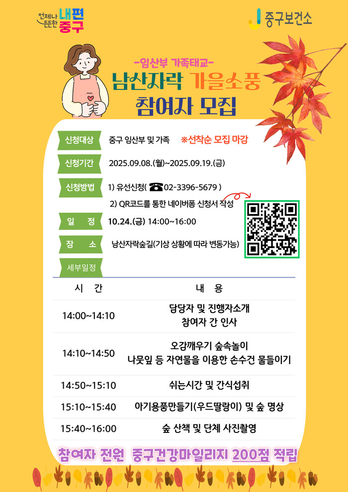 [시민일보 = 여영준 기자] 서울 중구가 오는 10월24일 오후2시 임산부 가족의 태교를 위해 남산자락숲길 가을소풍 프로그램을 운영한다.
