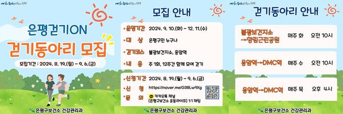 [시민일보 = 이대우 기자] 서울 은평구(구청장 김미경)가 하반기 ‘은평걷기ON’을 운영하고 오는 9월6일까지 걷기동아리 참가자를 모집한다.