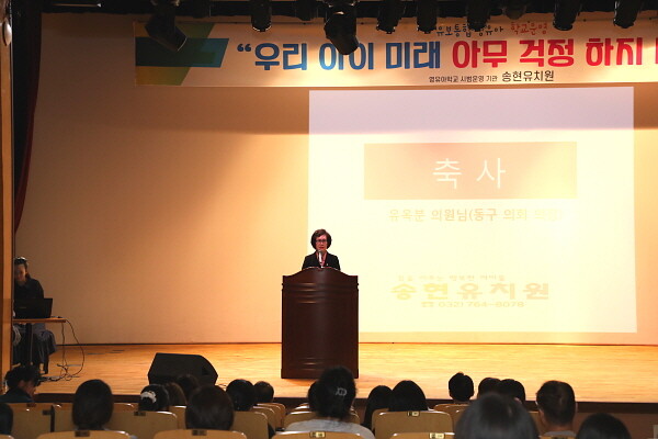 | ▲ 유옥분 동구의회 의장이 인천 동구청소년수련관에서 열린 『영유아 학교 시범사업 설명회』에 참석해 축사를 하고 있다. (사진제공=인천동구의회) |