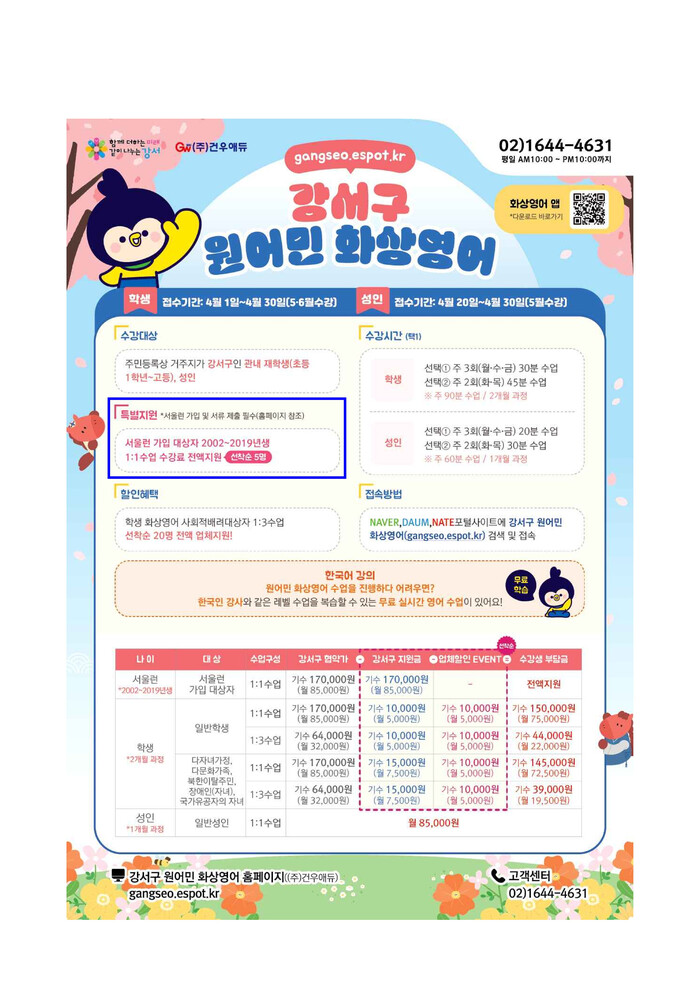 3기 수강생 모집은 4월1일부터 한 달간 진행되며, 강서구 원어민 화상영어학습 홈페이지((주)건우애듀, (주)이앤오즈)에서 회원가입 후 수강 신청하면 된다.
