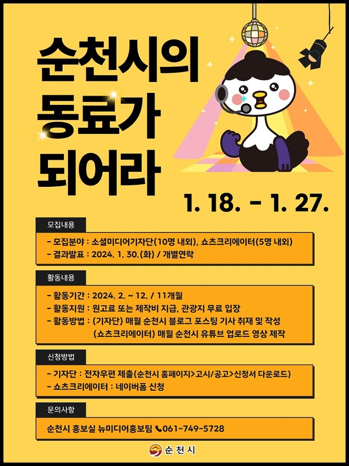 시 관계자는 “시민 크리에이터들과 함께 시시각각 변화하는 SNS 트렌드를 반영한 참신한 콘텐츠로 순천을 알리고, 시민과 소통해 나가겠다”며 “역량 있는 시민 크리에이터들의 많은 관심과 참여를 부탁드린다”고 전했다.