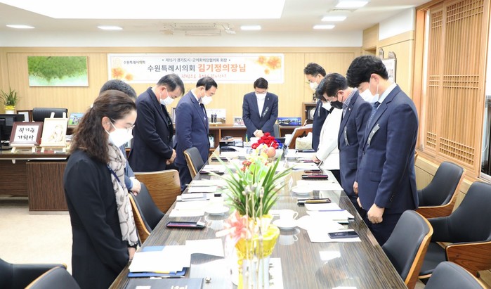 | ▲ 비상대책회의에 참석한 수원시의회 의장단이 회의에 앞서 묵념을 하고 있다.(사진제공=수원시의회) |