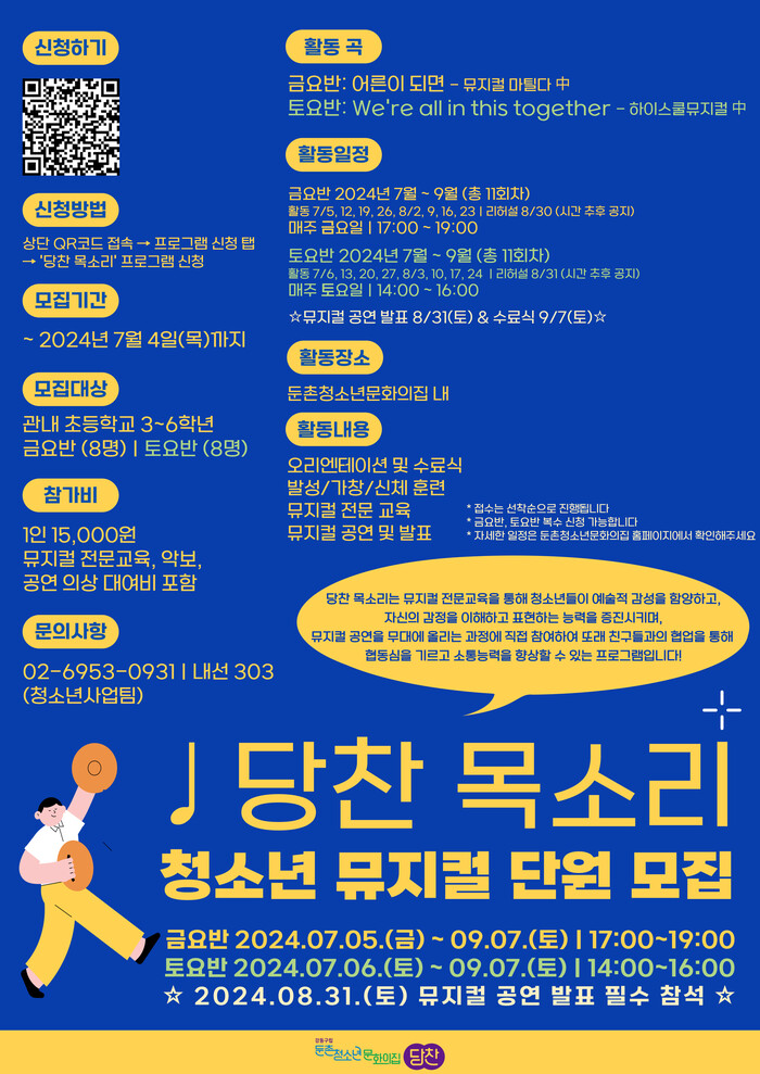 이 프로그램은 참여자들이 뮤지컬을 직접 배우고 무대에 출연해 볼 수 있도록 기획돼, 청소년들에게 특별한 여름 방학 추억을 제공할 예정이다. ‘당찬 목소리’의 청소년 뮤지컬 단원은 7월4일까지 모집한다.