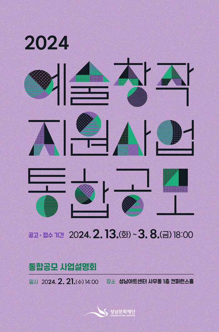 ‘모든예술 31’과 청년예술 지원사업 중 ‘예비예술인 지원 프로젝트’를 제외한 모든 공모는 오는 3월 8일(금)까지 접수하며, 오는 2월 21일(수) 2시부터 성남아트센터 사무동 1층 컨퍼런스홀에서 이번 통합공모 사업설명회를 진행한다.