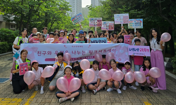 이날 캠페인에는 청소년지도위원회, 영덕1동 행정복지센터, 교직원, 학생자치회 등 40여 명이 참여해 학교폭력과 청소년 유해환경의 위험성을 알리고 학생들과 직접 소통했다. 특히 학생들과 교직원 일부는 핑크색 의상이나 소품을 착용하여 따돌림 없는 학교 만들기 캠페인에 동참했다.