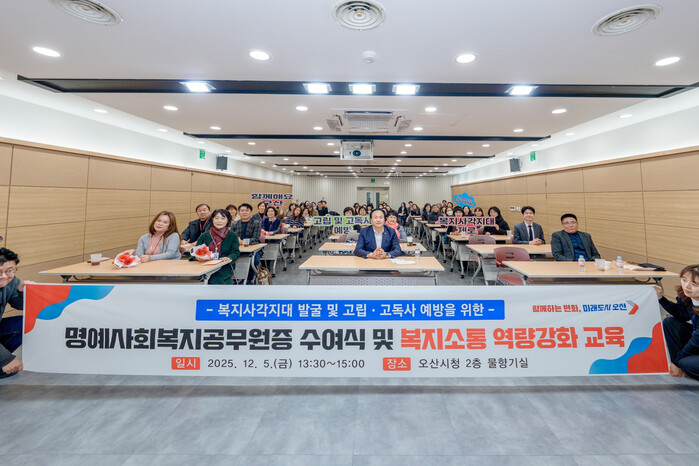 경기 오산시가 최근 지역사회보장협의체 위원 및 명예사회복지공무원 등 80여명이 참석한 가운데 ‘명예사회복지공무원증 수여식 및 복지소통 특강’을 개최했다고 8일 밝혔다.
