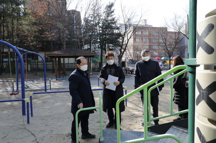 경기 수원시 팔달구가 22일 숙지어린이공원 등 녹지공원과 현안사업 대상지 3곳을 현장 점검했다. 구는 올해 지역내 노후 어린이공원 2곳(화서2동·인계동) 리모델링 및 서호천변 공공공지 산책로 정비를 추진하고 있다. 사진은 김현광 구청장(왼쪽)이 관계자들과 현장 점검을 하는 모습. (사진제공=팔달구청)